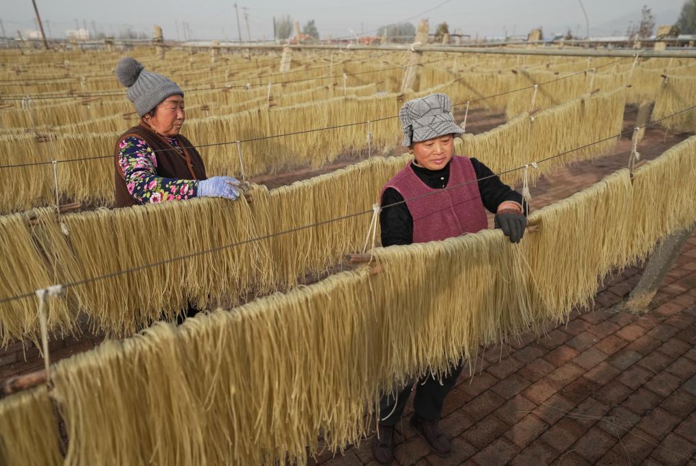 11月17日,河北省遵化市平安城镇一家传统手工粉条加工合作社的社员在晾晒粉条。