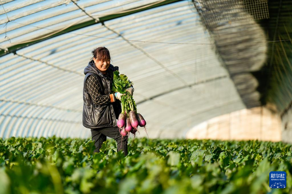 11月26日,河北省滦州市茨榆坨镇芦苇庄村农民在大棚内采收萝卜。
