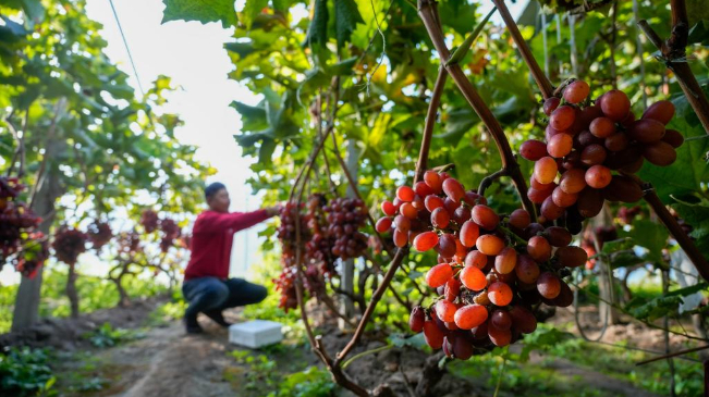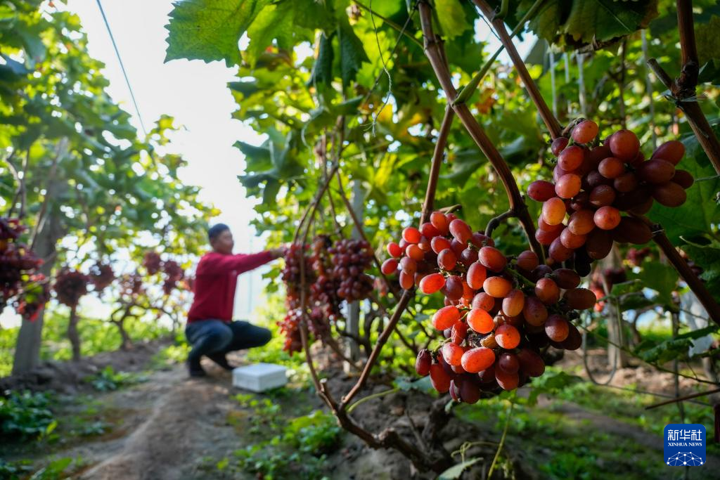11月26日,游客在河北省滦州市茨榆坨镇芦苇庄村一处大棚内采摘葡萄。