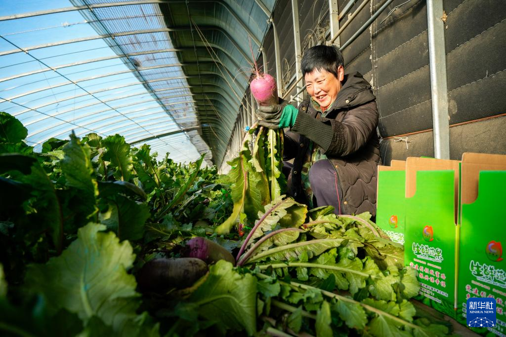 11月26日,河北省滦州市茨榆坨镇芦苇庄村农民在大棚内将采收的萝卜装箱。