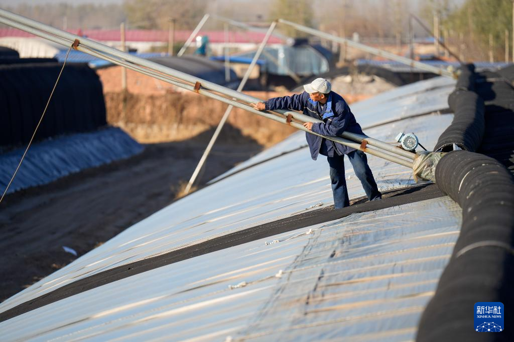 11月26日,河北省滦州市雷庄镇后店子村农民在调整大棚保温被。