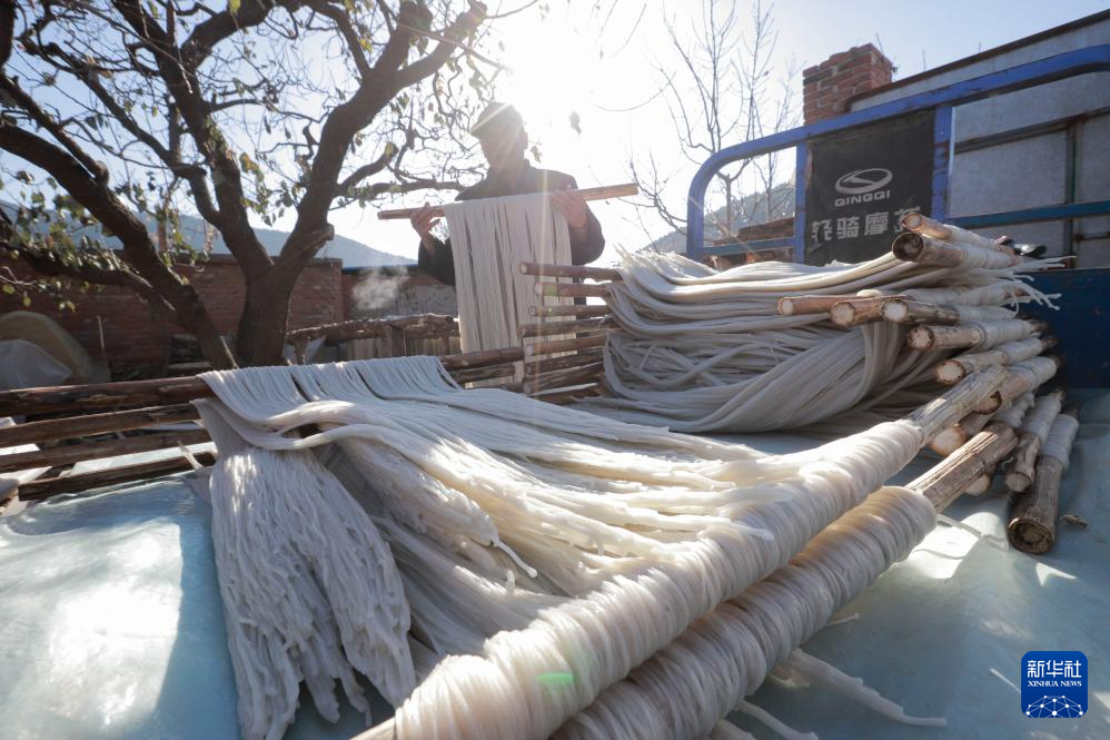11月28日,河北省石家庄市元氏县黑水河乡北沙滩村农民在晾晒红薯粉条。