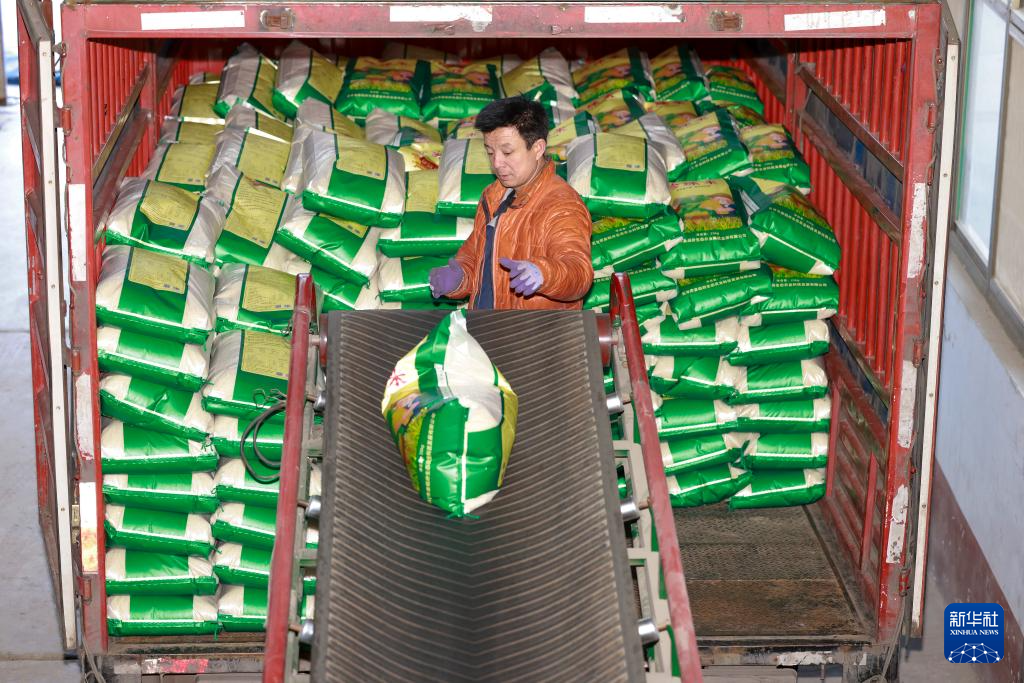 11月30日,唐山市丰南区西葛镇一粮食加工企业的工人在搬运加工好的大米。