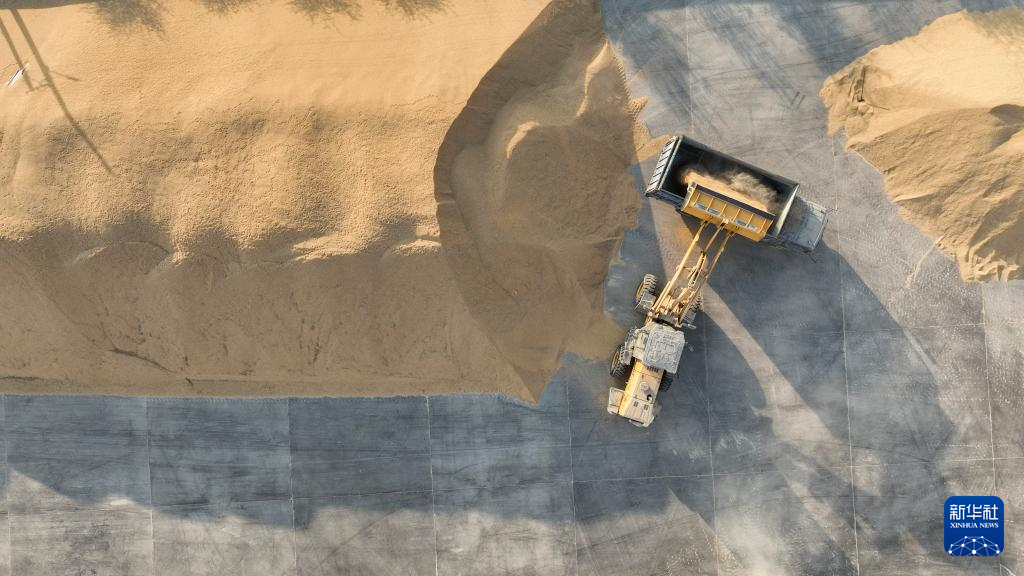 11月29日,唐山市丰南区西葛镇一粮食加工企业的工人在装运稻谷(无人机照片)。