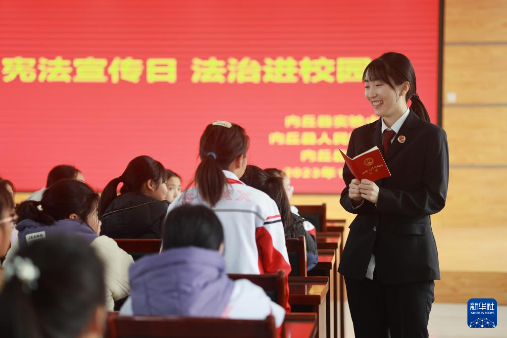 12月4日,在河北省邯郸市成安县第七中学东城校区,成安县检察院工作人员给学生讲解宪法知识。