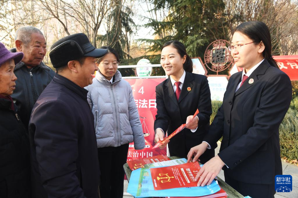 12月4日,在河北省石家庄新乐市百福园公园,新乐市人民检察院工作人员给群众讲解宪法知识。