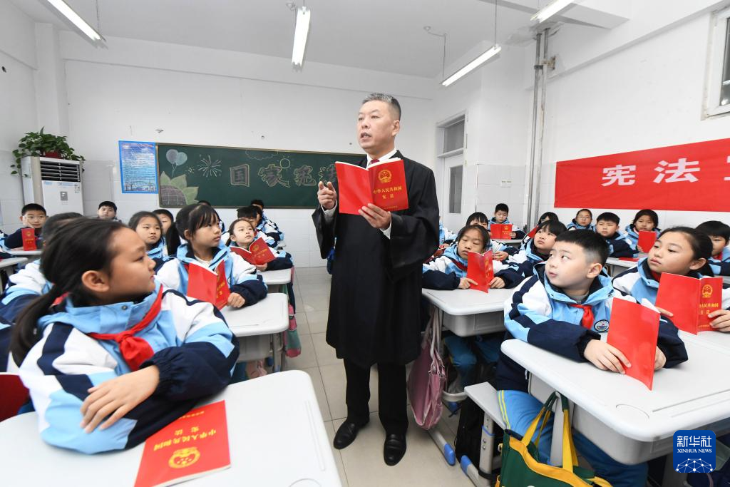 12月4日,在河北省遵化市苏家洼镇大刘庄中心小学,法官给学生讲解宪法知识。