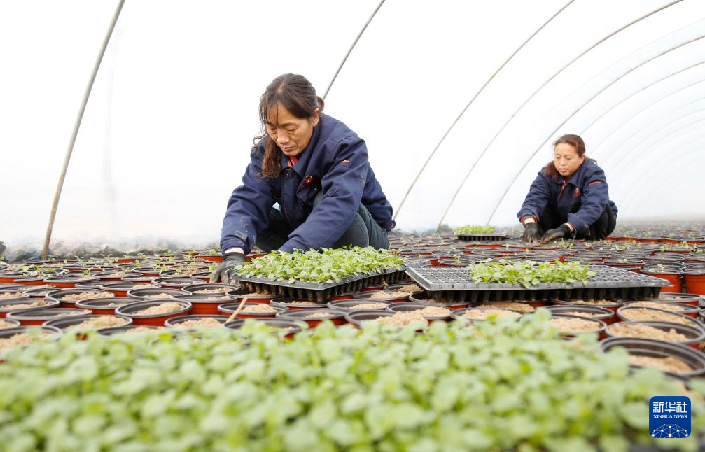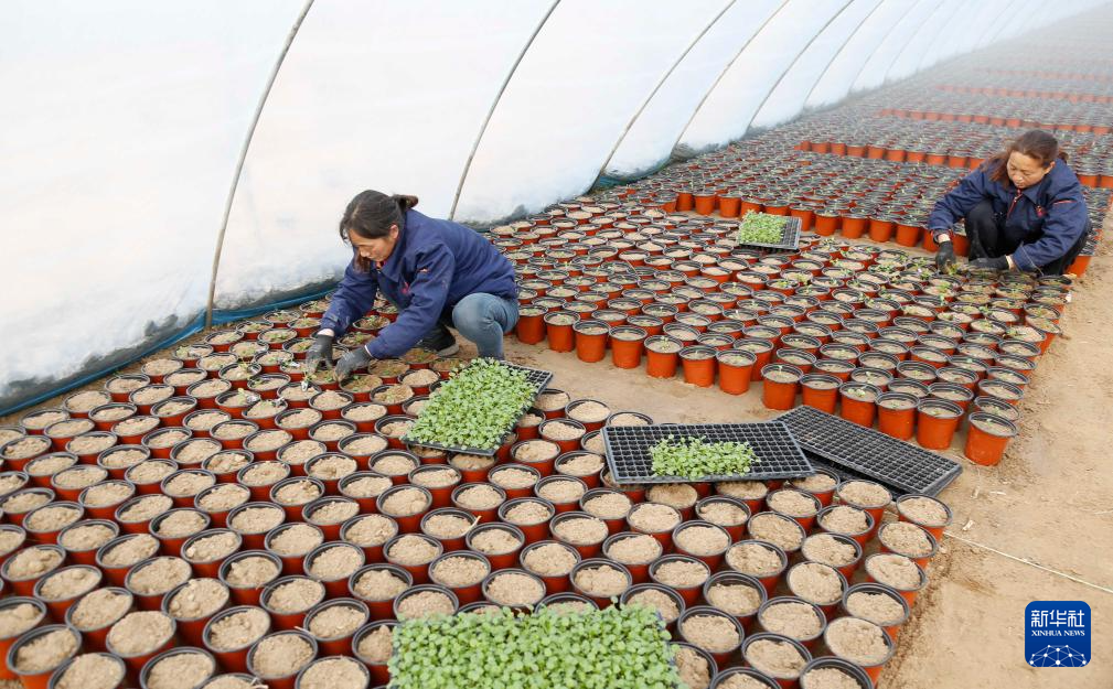 12月9日,花农在邢台市南和区和阳镇鲜花种植基地定植花苗。