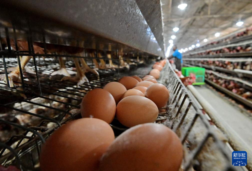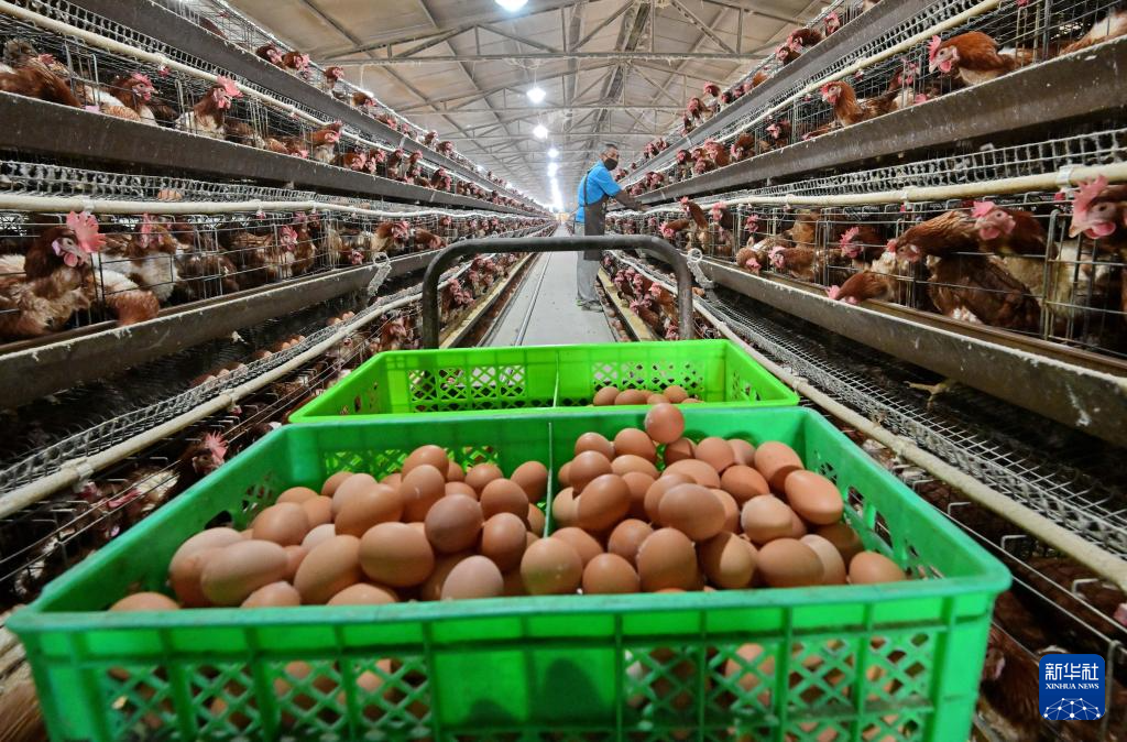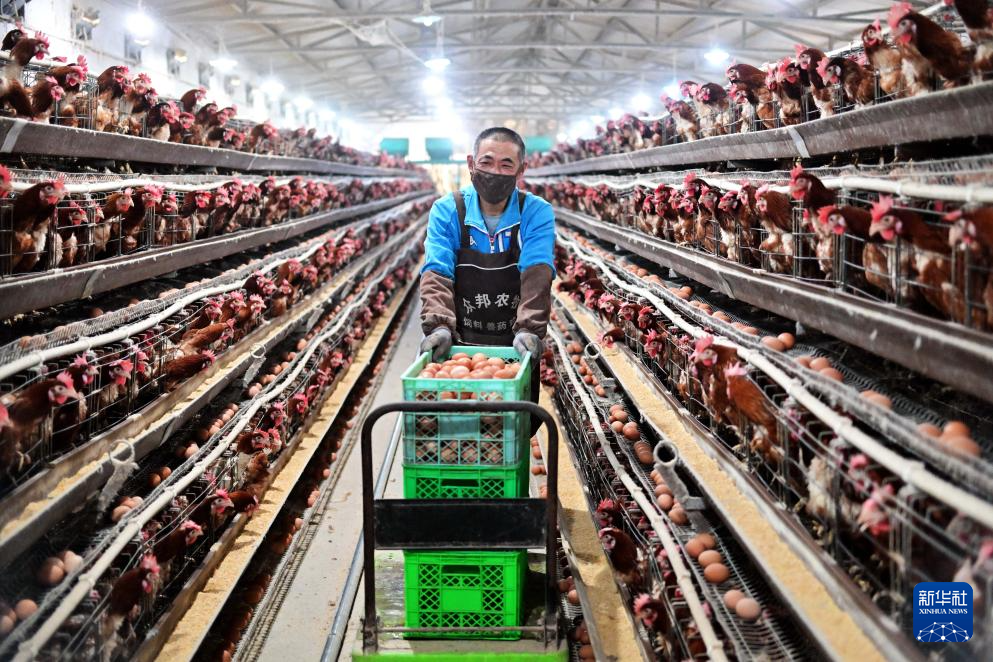 12月16日,河北省滦州市滦城街道办事处后明碑村一家蛋鸡养殖合作社的社员在鸡舍内捡拾鸡蛋。