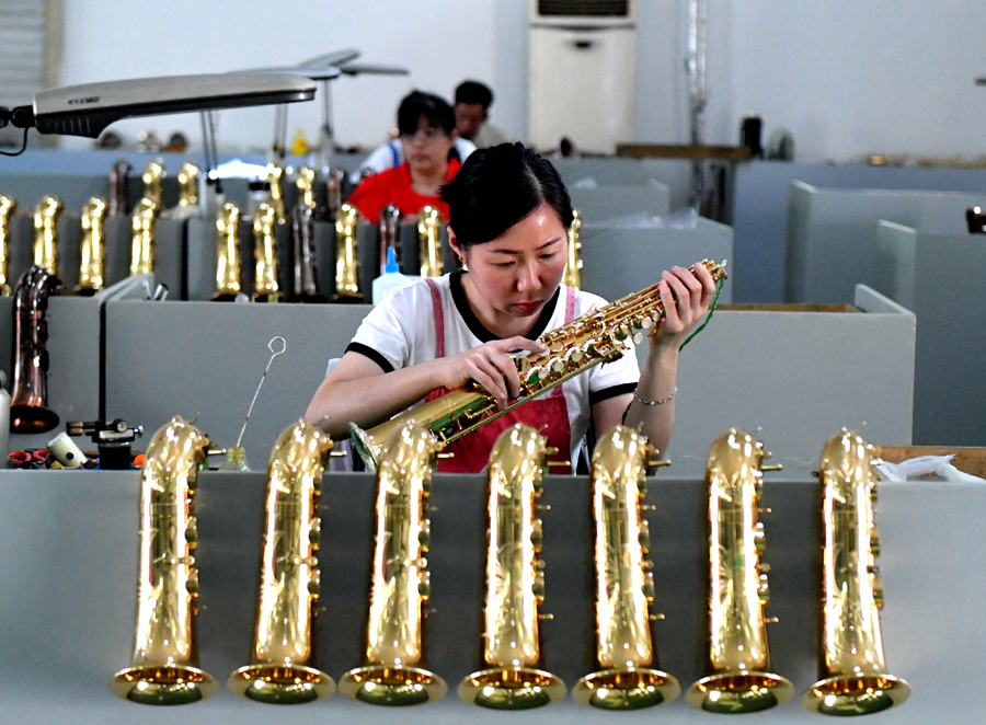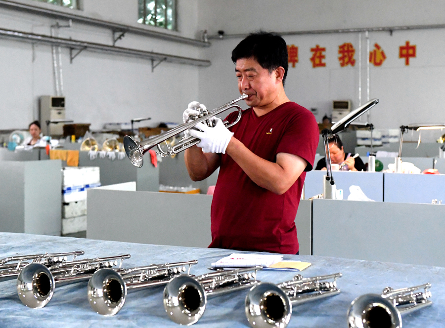 一家乐器企业的工作人员在检验新制作的乐器。贾枭梦 摄