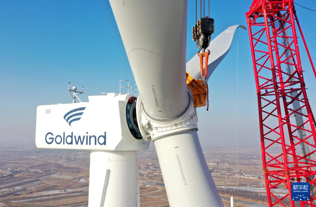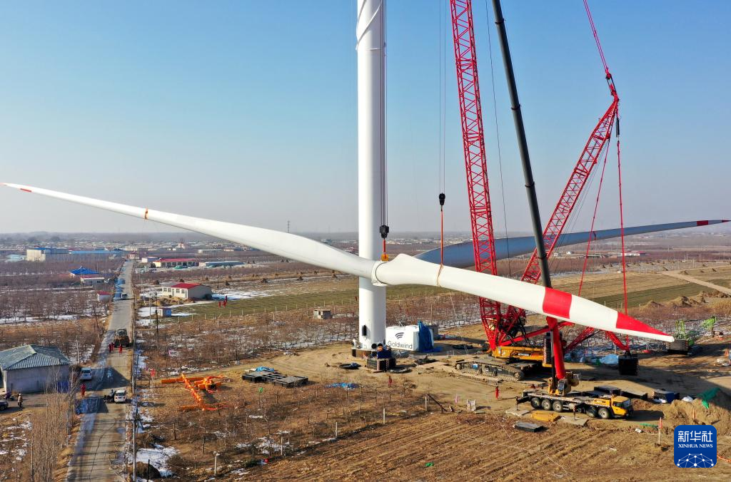 12月28日,工人在河北秦皇岛昌黎县泥井镇前北庄村附近一处建设中的风电场安装风力发电机(无人机照片)。