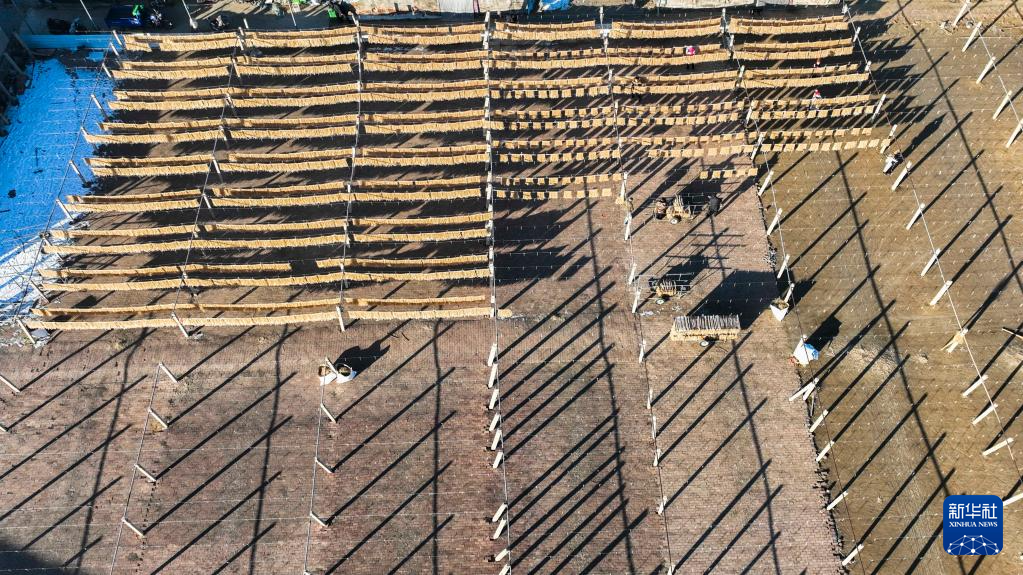 1月15日,农民在河北省遵化市平安城镇一家粉条加工专业合作社的场院晾晒粉条(无人机照片)。