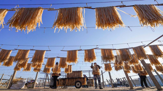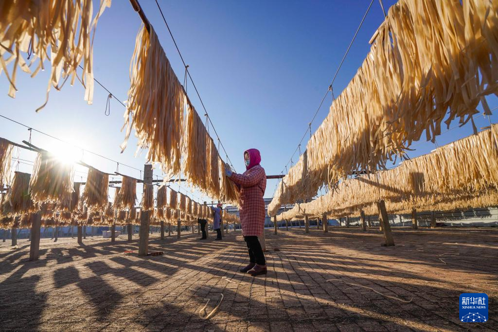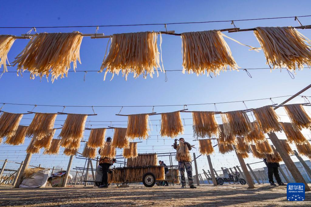 春节前夕,河北省遵化市平安城镇各粉条加工专业合作社的场院一片忙碌,农民们利用晴好天气晾晒粉条,供应节日市场。