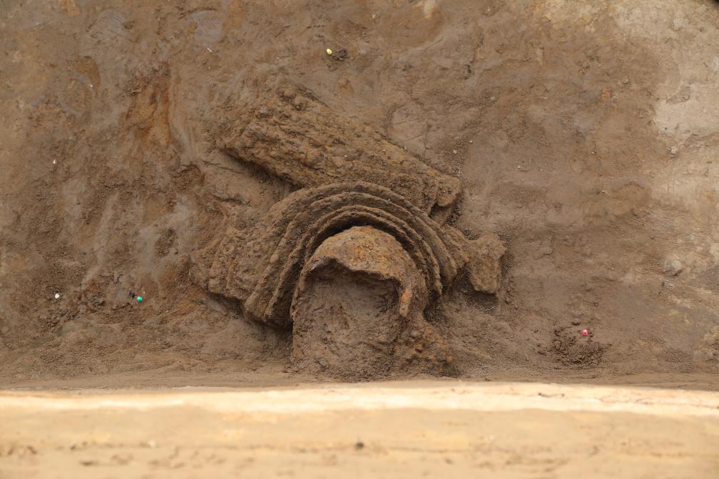 朱明门外护城河发掘出土的铁兜鍪。(受访单位供图)