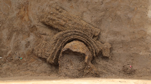 记者从邺城考古队获悉,2023年度在对东魏北齐邺城朱明门外护城河遗迹的发掘中,考古人员发现多处铠甲、兵器等战争遗留,以及砖砌“金刚墙”和等距均匀分布的柱洞等遗迹,铠甲、兵器等珍贵文物已进行整体套箱,运回实验室进行进一步细致考古清理。