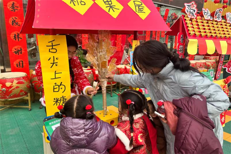 家长和小朋友在美食摊位前购买食品。郭平平摄