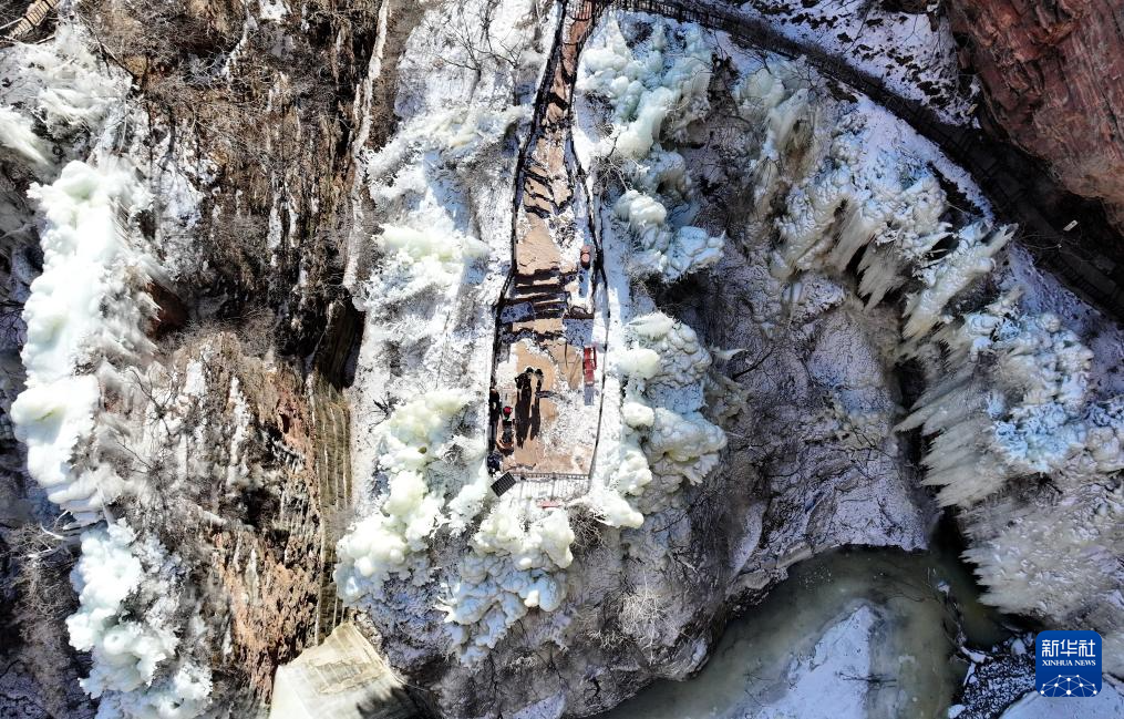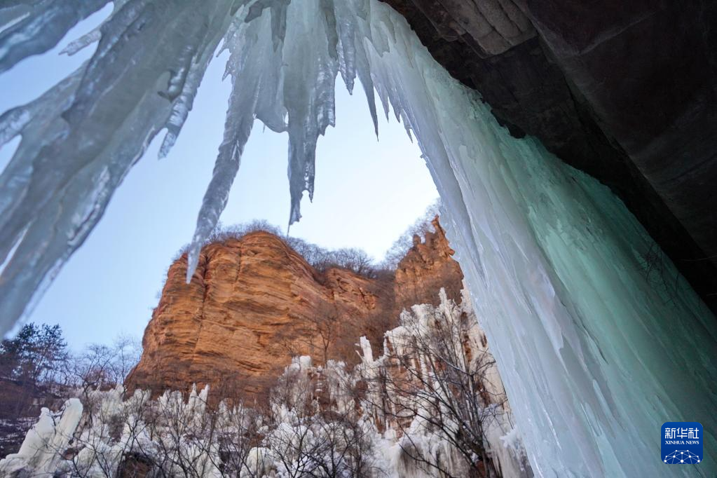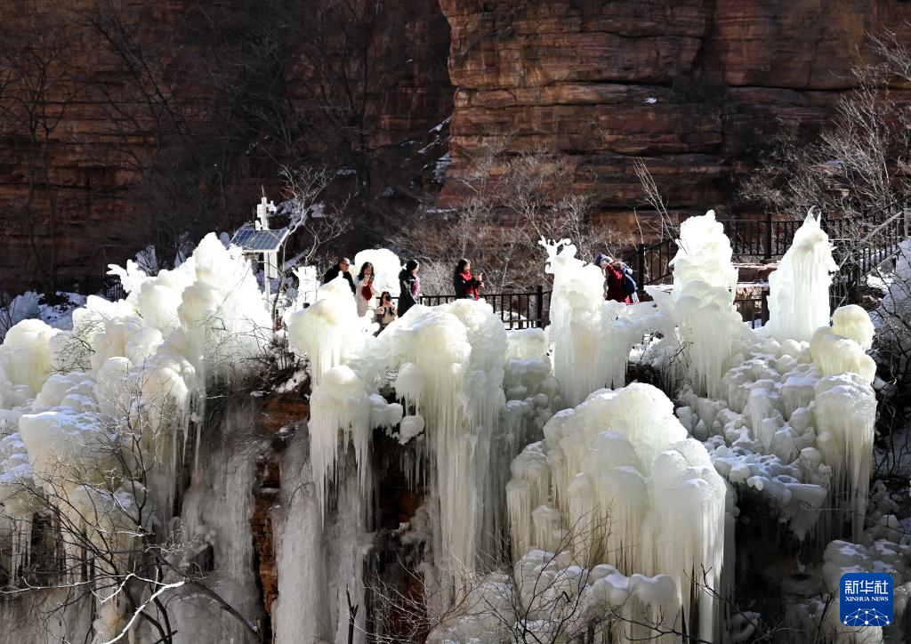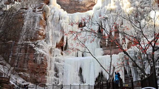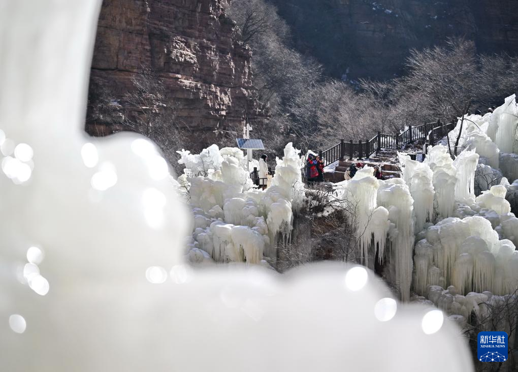 寒冬时节,河北省石家庄市赞皇县嶂石岩景区冻凌背瀑布出现冰瀑美景,形态各异的冰柱悬挂在山间,吸引不少游客前来观赏。