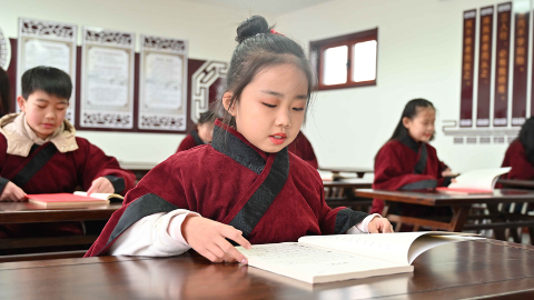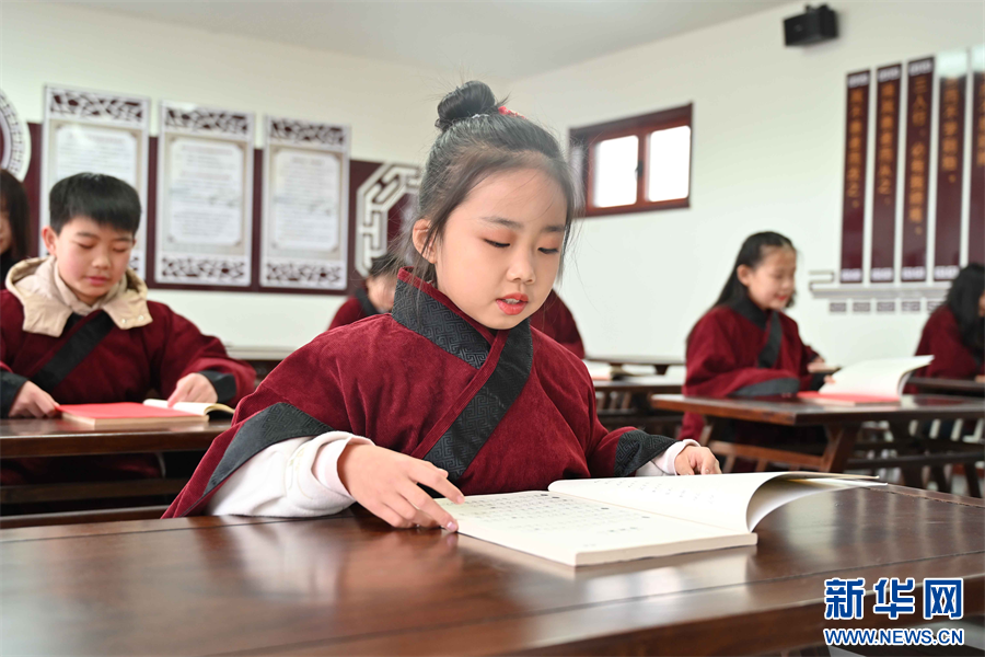 小朋友们身穿汉服,诵读关于元宵节的古诗词。新华网发 刘蒙蒙 摄