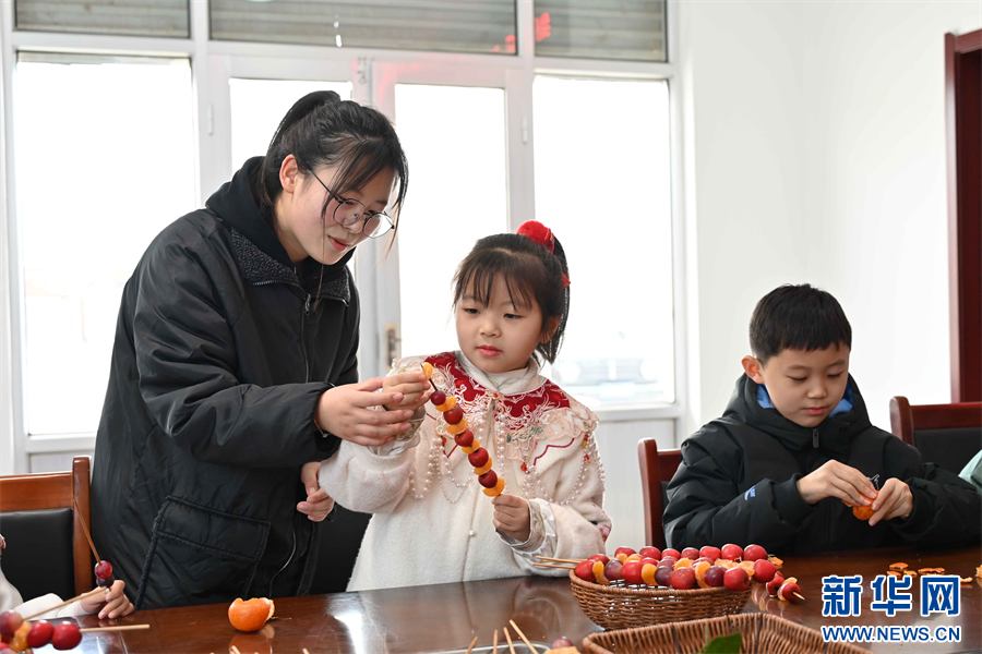 元宵节前夕,在河北省沧州市盐山县韩集镇南马庄村活动中心,青年志愿者和小朋友们齐聚一堂,开展读国学经典、猜灯谜,制作糖画、糖葫芦等活动,让小朋友们在欢乐喜庆的氛围中体验传统民俗的乐趣。