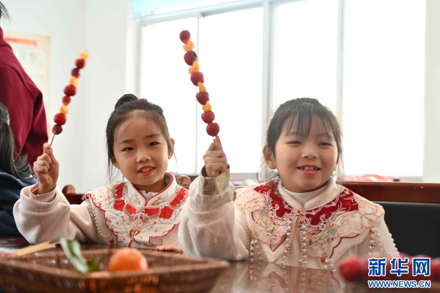 小朋友们展示自己制作的糖葫芦。新华网发 刘蒙蒙 摄
