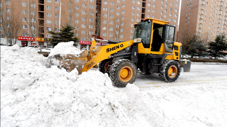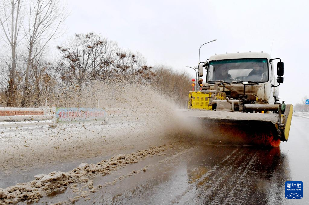 2月21日,河北省邯郸市成安县环卫工人驾驶车辆在城区主干道上清除积雪。