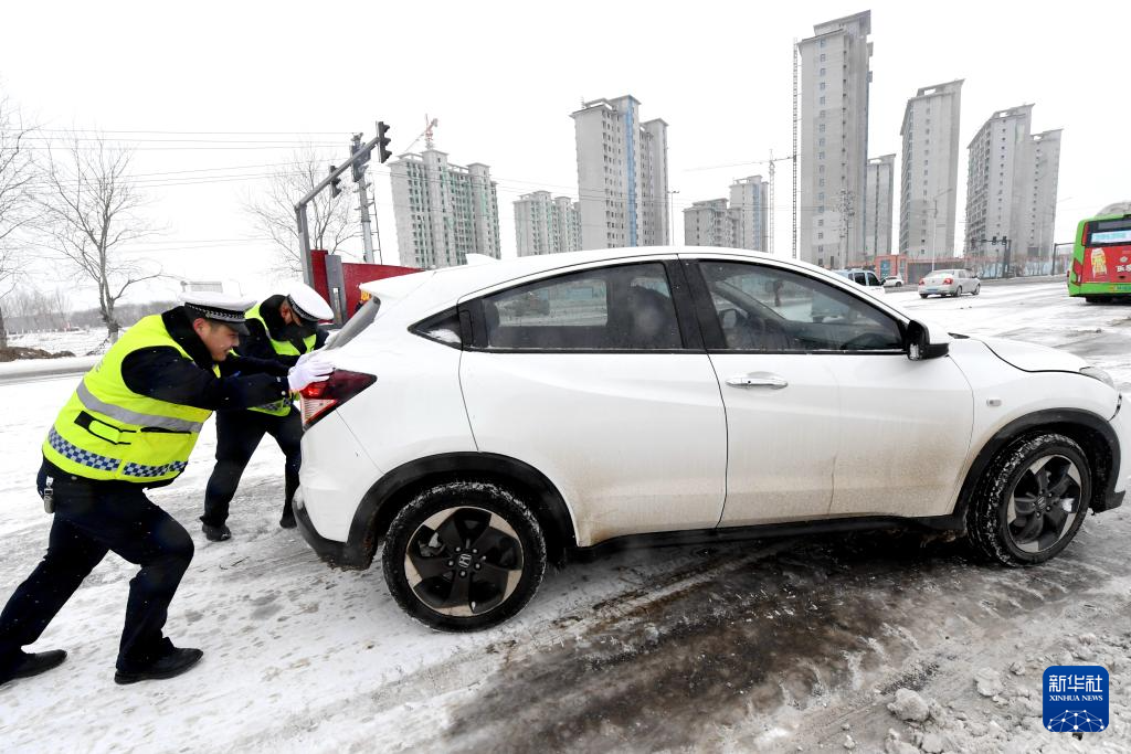 2月21日,交警在河北省邯郸市成安县城区主干道上帮助受困车辆。