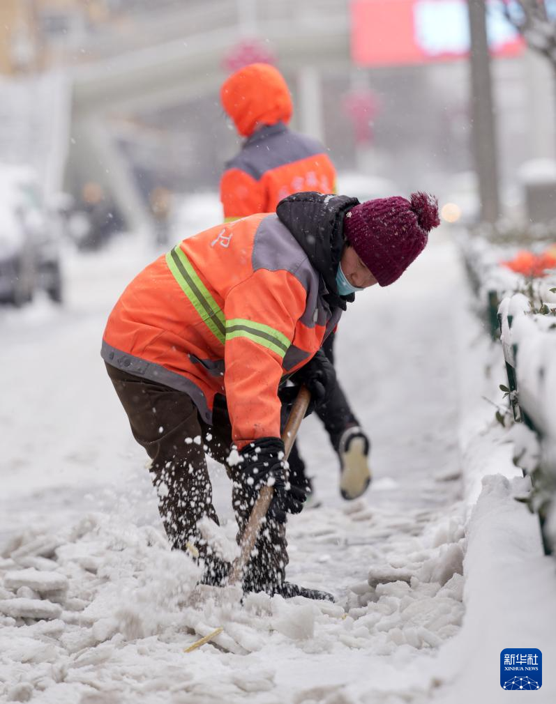 2月21日,在河北省石家庄市,环卫工人清理路面积雪。