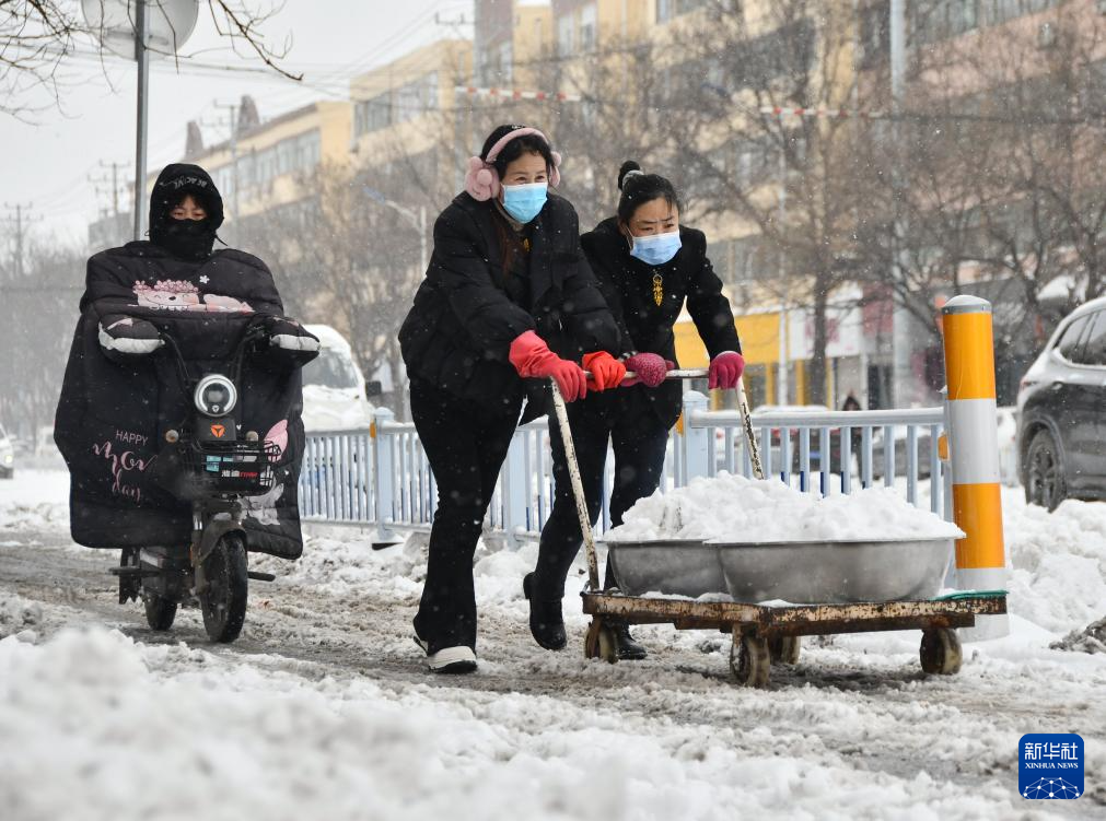 2月21日,河北省邯郸市成安县环卫工人和居民在城区主干道上清除积雪。