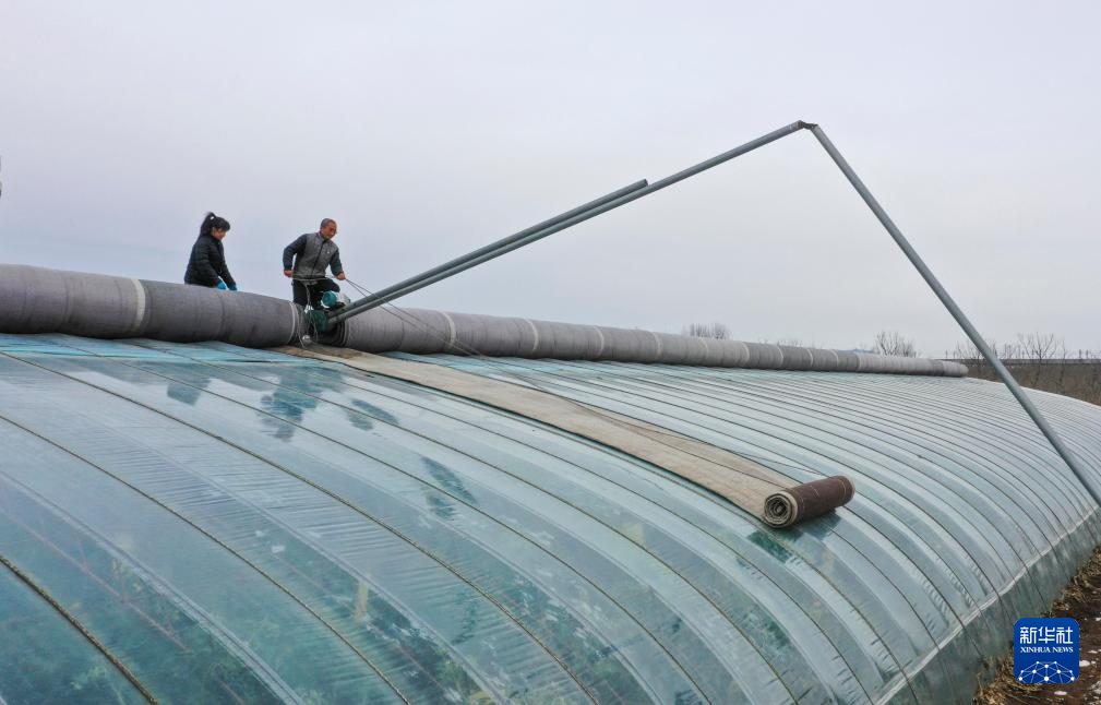 2月21日,河北省遵化市兴旺寨镇甘泽庄村的农民在苫盖大棚(无人机照片)。