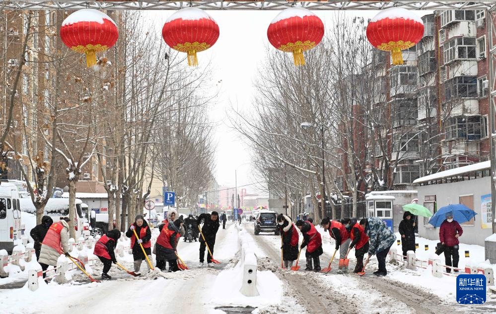 2月21日,志愿者在河北省石家庄市中华北大街附近清扫积雪。