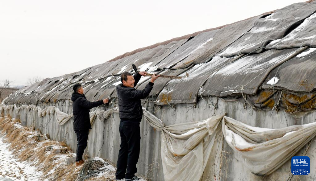 2月21日,河北省遵化市兴旺寨镇甘泽庄村的农民在清理大棚积雪。