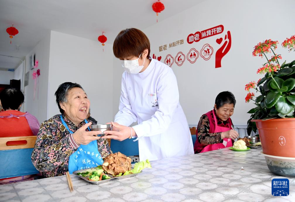 2月29日,在香河县安平镇运河新村医养中心,工作人员为老人送上午餐。