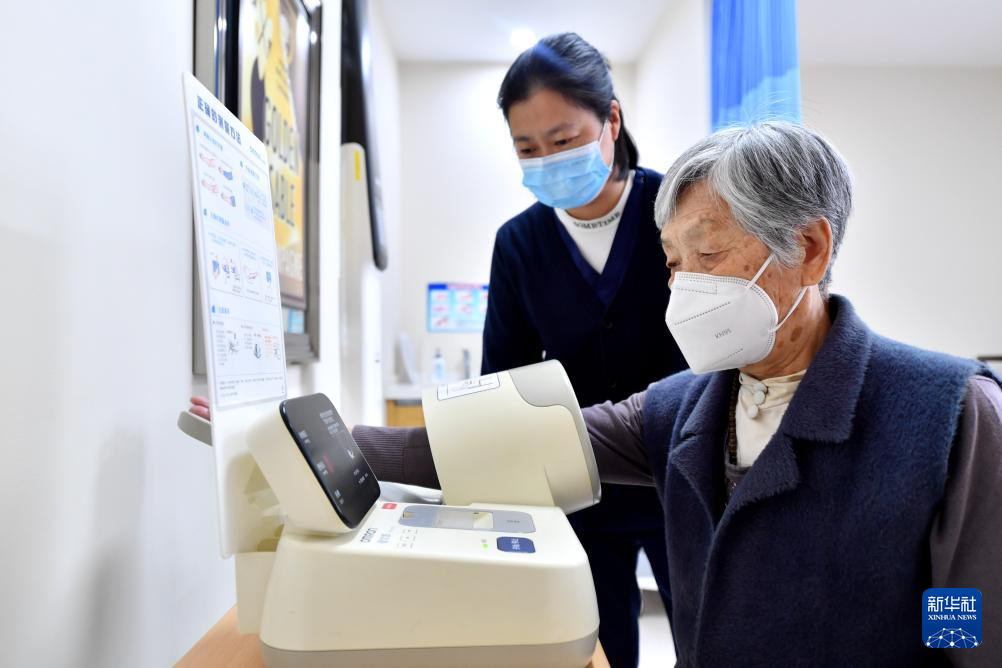 2月28日,一名老人在香河县大爱书院养老中心测量血压。目前,该中心有600余名老人入住,其中约90%的老人来自北京。
