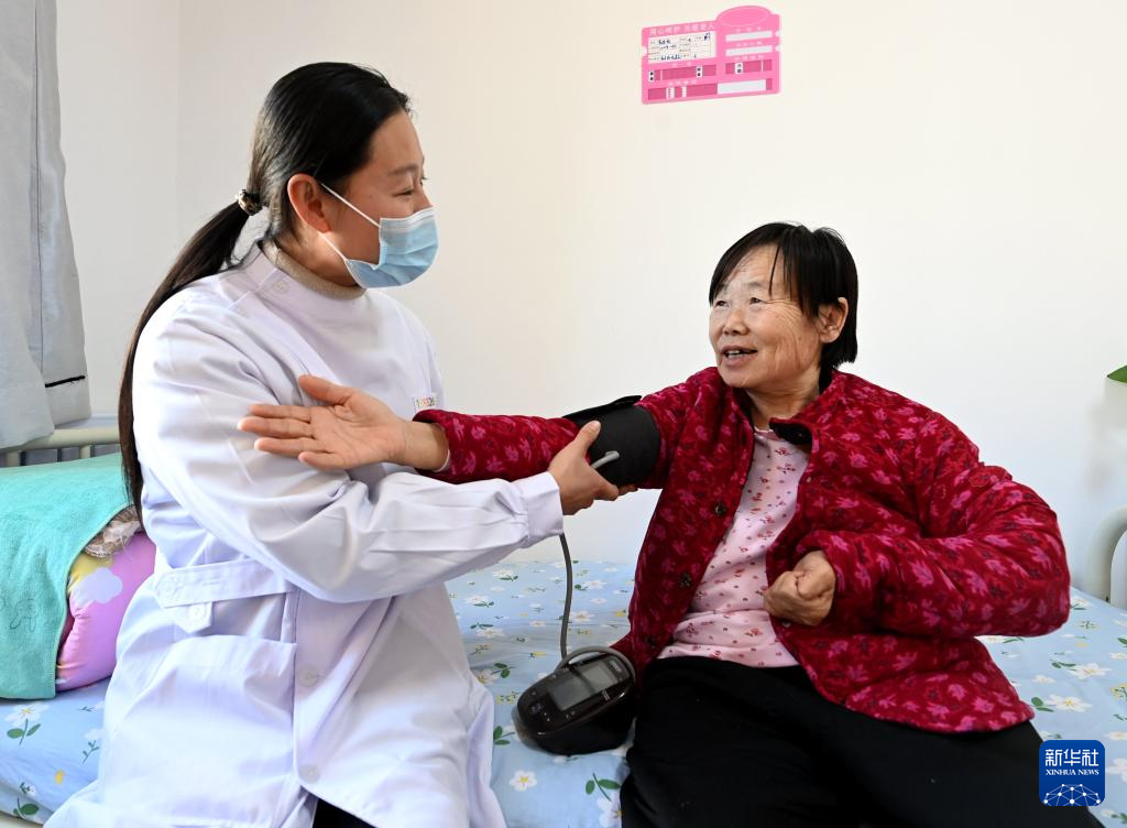 2月29日,在香河县安平镇运河新村医养中心,医护人员为老人测量血压。