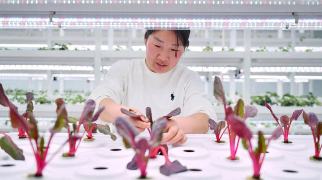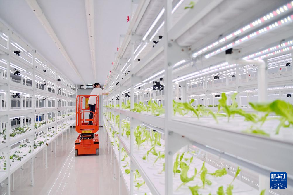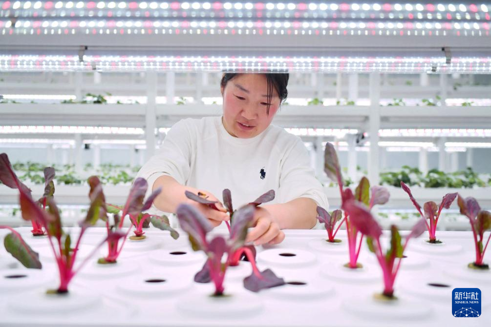 3月8日,馆陶县一家现代农业示范园区的工作人员在智能温室内查看水培蔬菜生长情况。