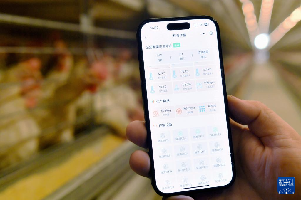 3月8日,在馆陶县一家智慧蛋鸡养殖产业示范园,工作人员通过移动端查看信息。