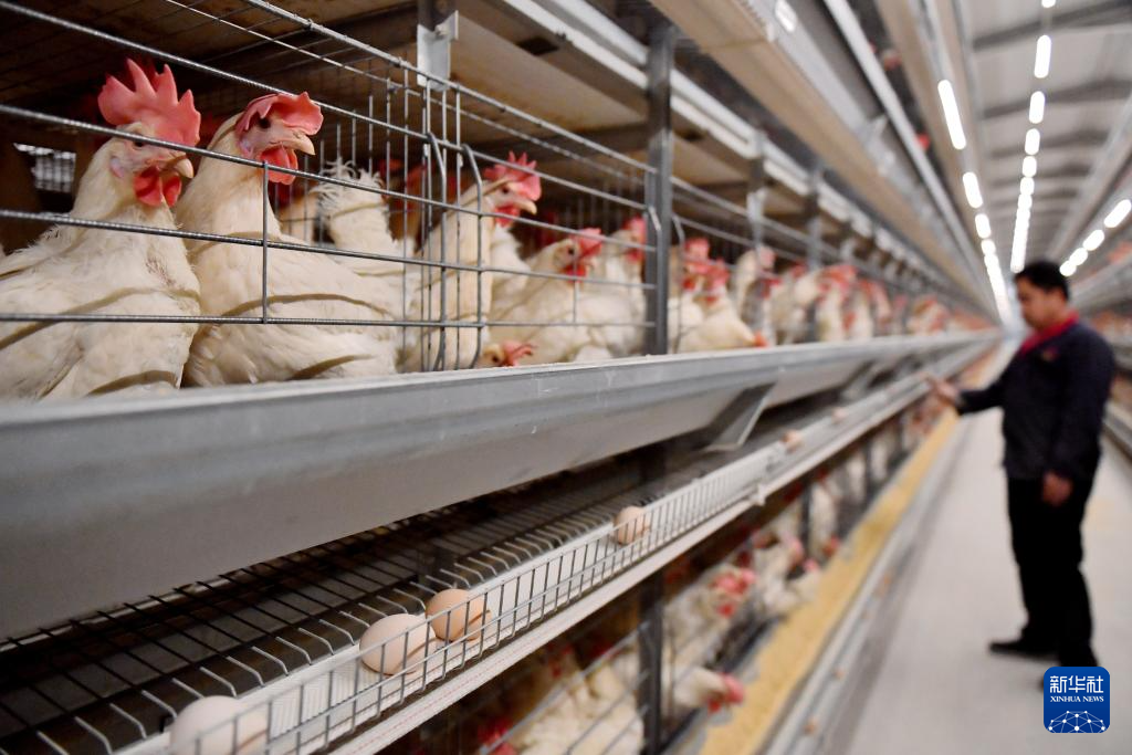 3月8日,在馆陶县一家智慧蛋鸡养殖产业示范园,工作人员查看自动化蛋鸡笼养设备运行情况。