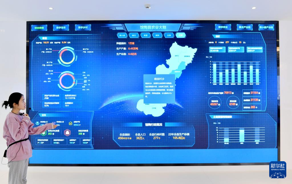 3月8日,在馆陶县现代农业产业园农业农村大数据中心,工作人员在介绍“农业大脑”系统。