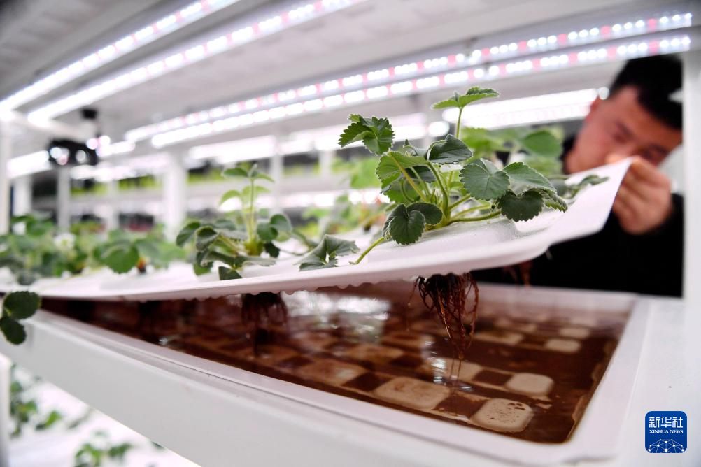 3月8日,馆陶县一家现代农业示范园区的工作人员在智能温室内查看水培草莓生长情况。