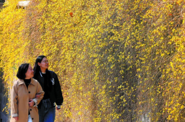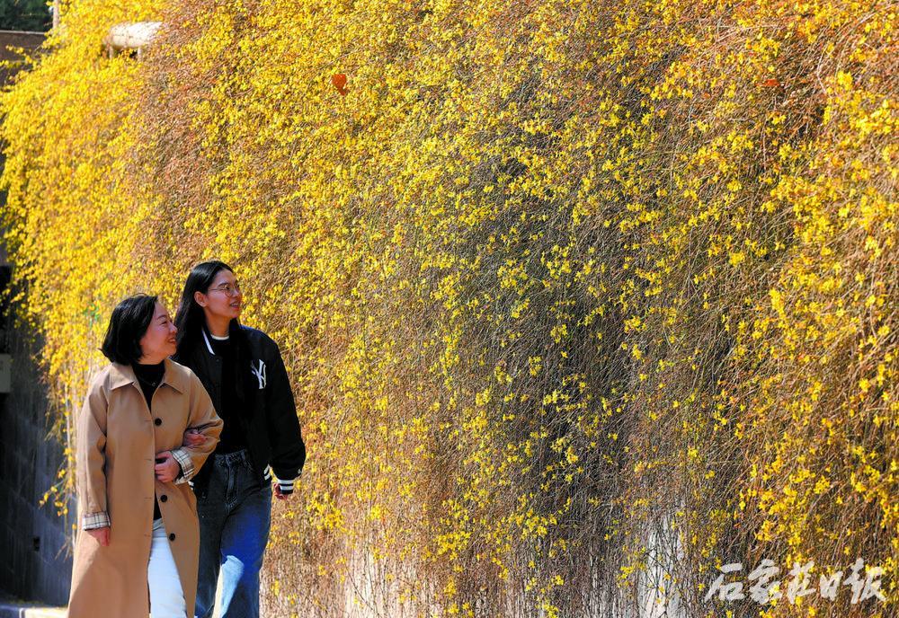 这是蛰伏了一冬的绽放,挨挨挤挤的黄色小花,相拥着站成一道花瀑,就那样亮闪闪地出现在你的眼前,让你心生欢喜,奔跑着凑近它,渴望与之相融。没错,这里就是人民广场东侧地下车库入口处的北墙上。两个年轻的女孩笑着奔向它们,留下美丽的倩影;一位妈妈带着3岁的小男孩儿也来了,看到这满眼的黄,小男孩不由自主地伸出了手,妈妈及时制止了他,鼓励他去嗅一嗅这充满春天的味道。“这绽放的迎春花,就是春天,就是希望。”市民张女士站在花瀑前笑靥如花。