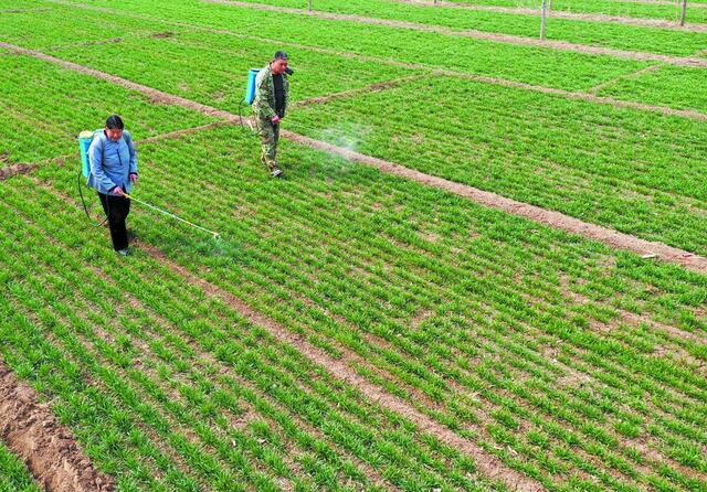 农民身背喷雾器,在麦田里给小麦喷药。