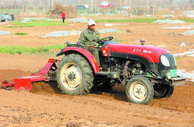 农民驾驶农机正在对田地进行旋耕。