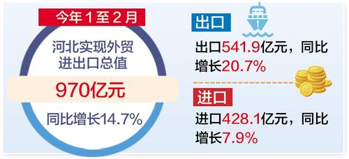持续增长的新业态外贸数据,折射出全省外贸市场不断回暖的态势。据石家庄海关统计,今年1至2月,河北实现外贸进出口总值970亿元人民币(下同),同比增长14.7%。其中,出口541.9亿元,同比增长20.7%;进口428.1亿元,同比增长7.9%。