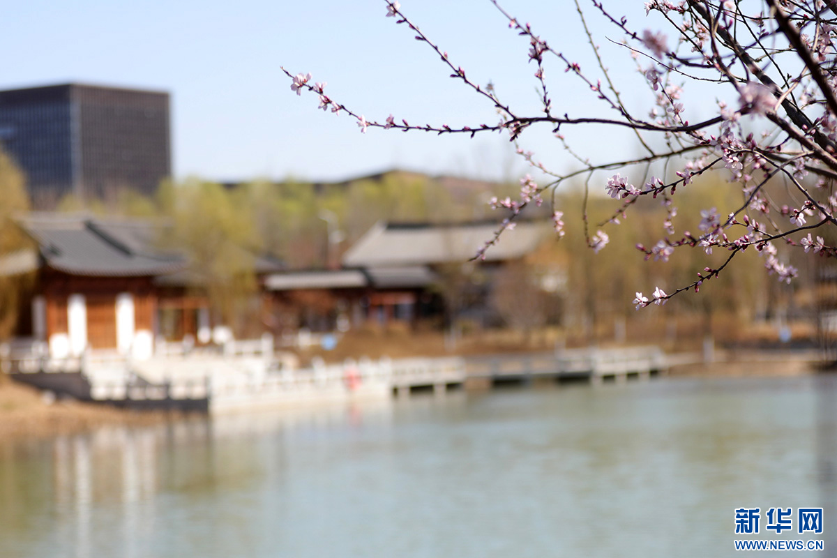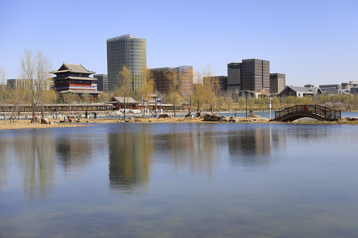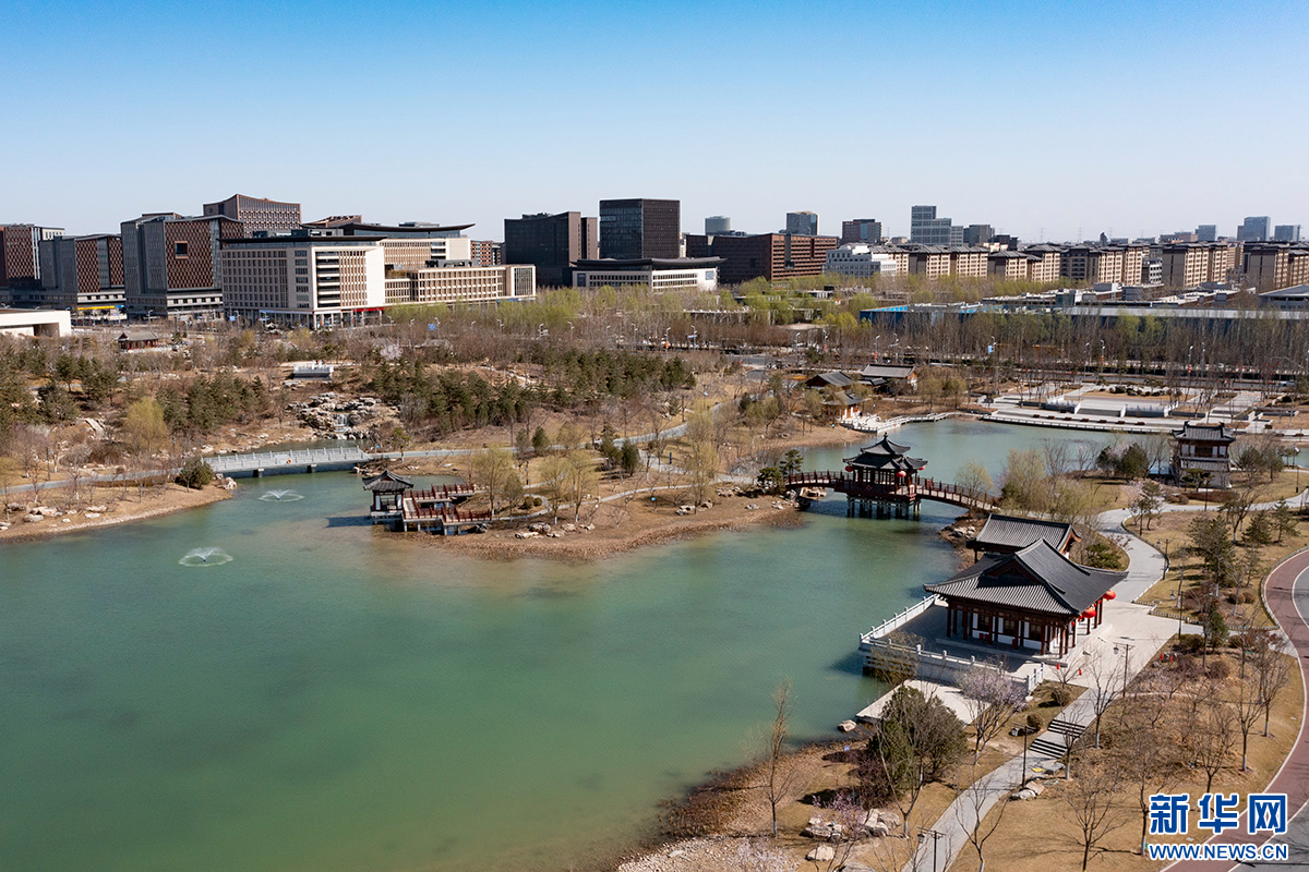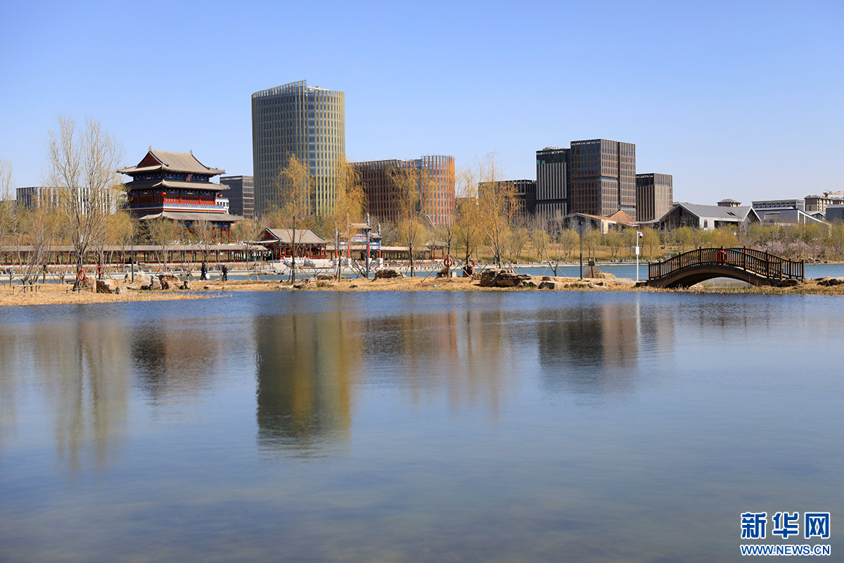 在雄安新区金湖公园,仿古建筑与周边现代建筑交相辉映。新华网 骆学峰 摄