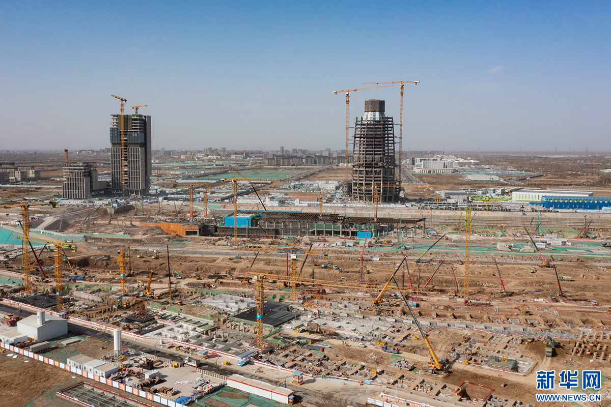 雄安城际站及国贸中心片区项目建设现场塔吊林立,一派繁忙景象。新华网 牛思佳 摄