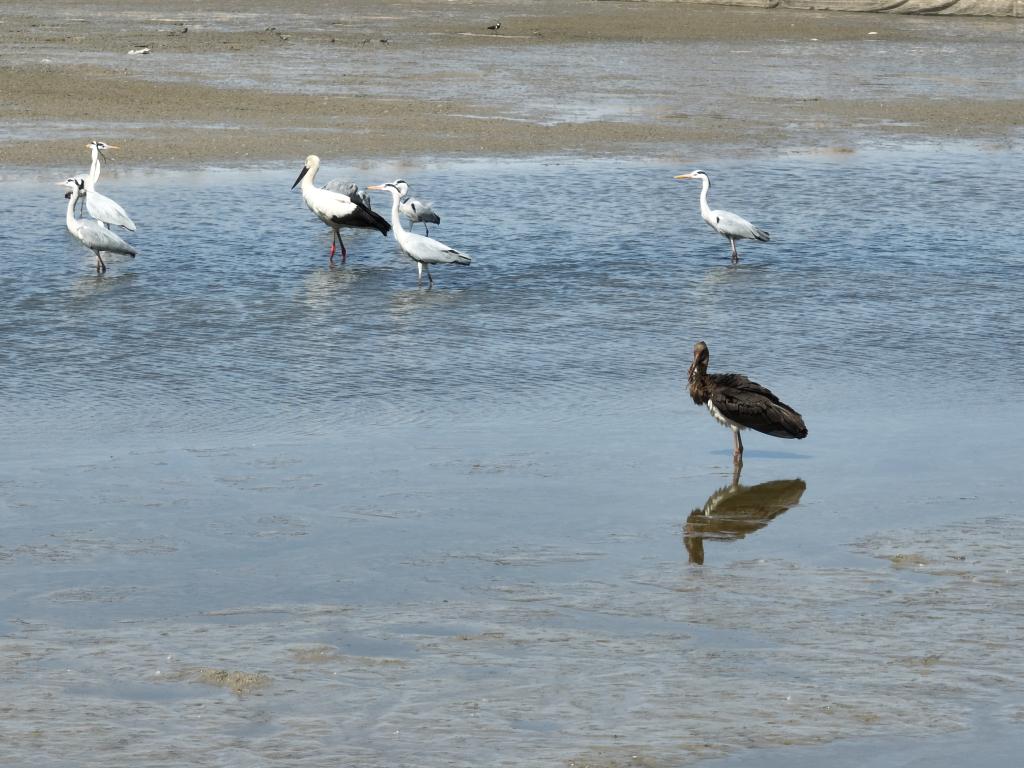 记者从河北衡水湖国家级自然保护区获悉,近日,保护区工作人员在进行鸟类调查监测时,在湖区浅水处看到一只黑色大鸟。经仔细观察和辨认,确认是国家一级保护动物黑鹳。在它旁边,五只苍鹭簇拥着一只国家一级保护动物东方白鹳。专家表示,东方白鹳和黑鹳虽都为涉禽,但同框觅食的情况十分罕见。