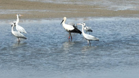 据了解,黑鹳和东方白鹳均为鹳形目鹳科鹳属鸟类、全球濒危珍禽。其中,黑鹳喜在沼泽和湿地上觅食鱼、蛙、甲壳类和昆虫等。作为一种大型涉禽,黑鹳一般在浅滩处觅食,目前在我国仅存1000只左右。东方白鹳主要栖息于湖泊、水库、池塘等边缘的浅水区,有时也飞到树上停栖。