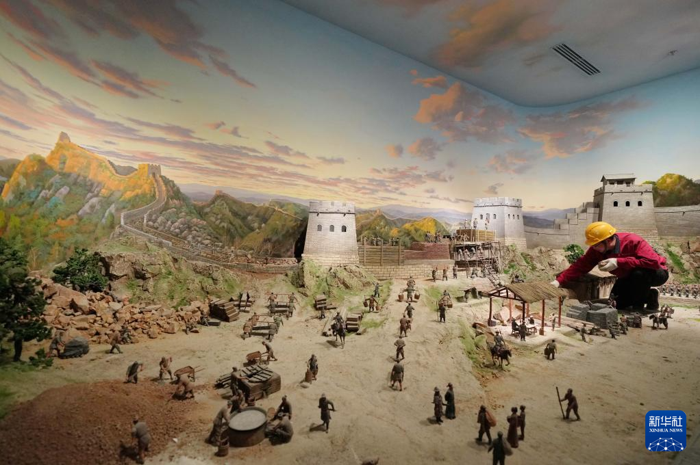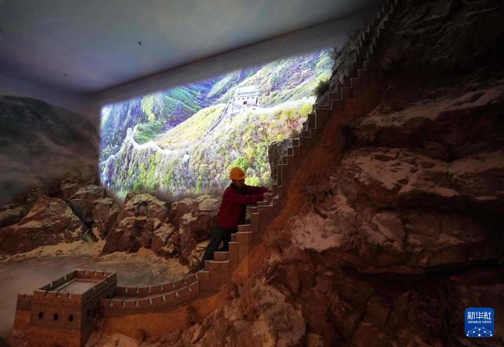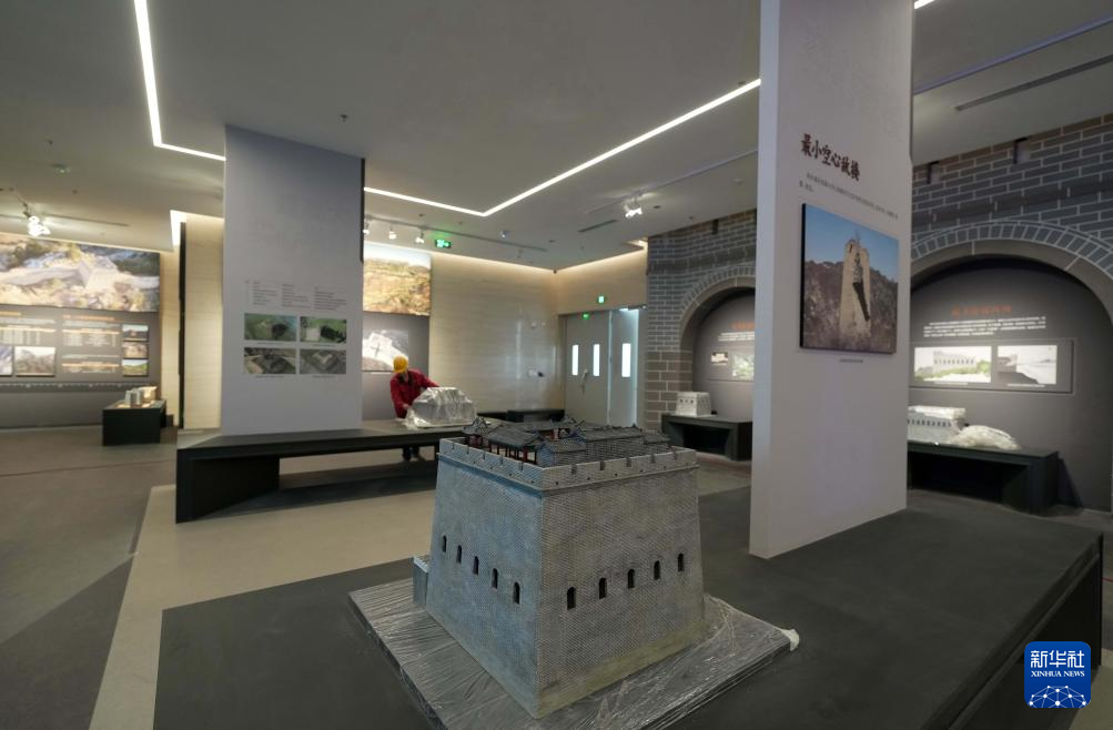 4月11日,工人在山海关中国长城博物馆展厅布展。