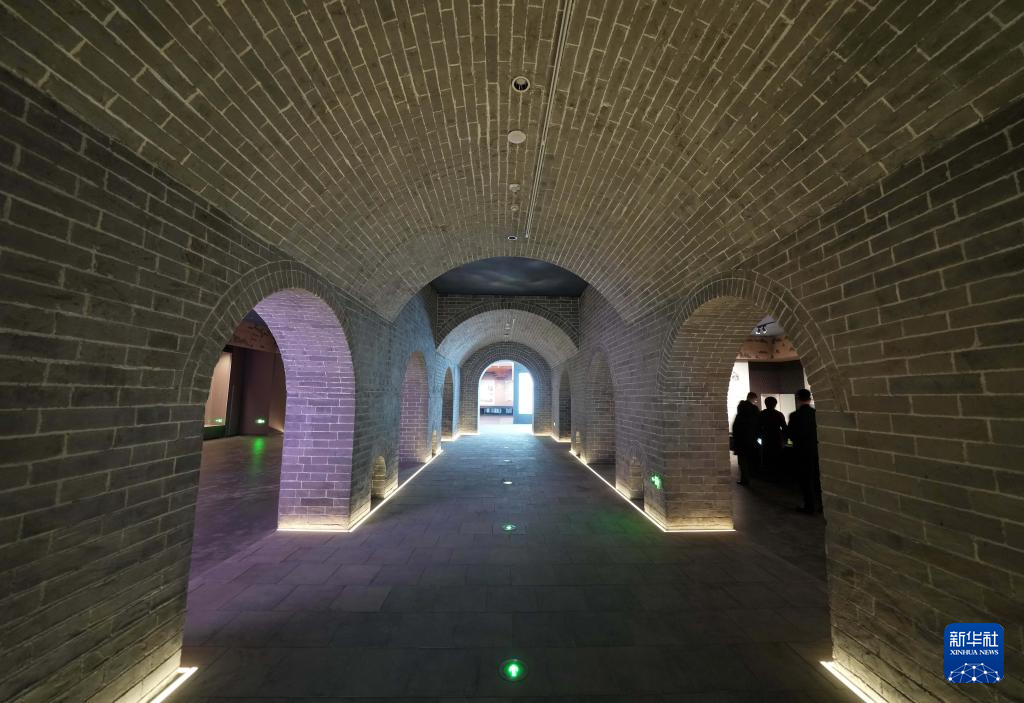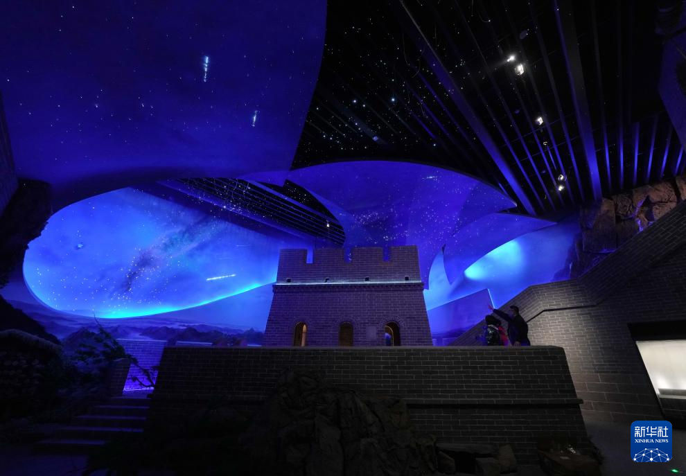 4月11日,工人在山海关中国长城博物馆展厅察看灯光效果。