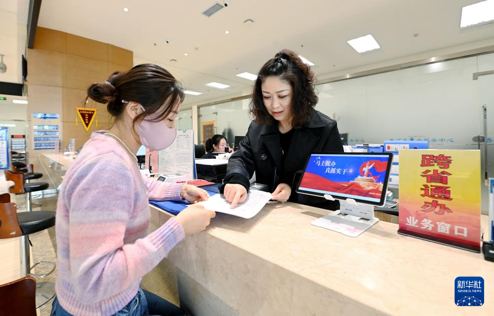 4月30日,工作人员(右)在位于香河县的北京城市副中心政务服务中心一体化办事大厅为市民办理业务。